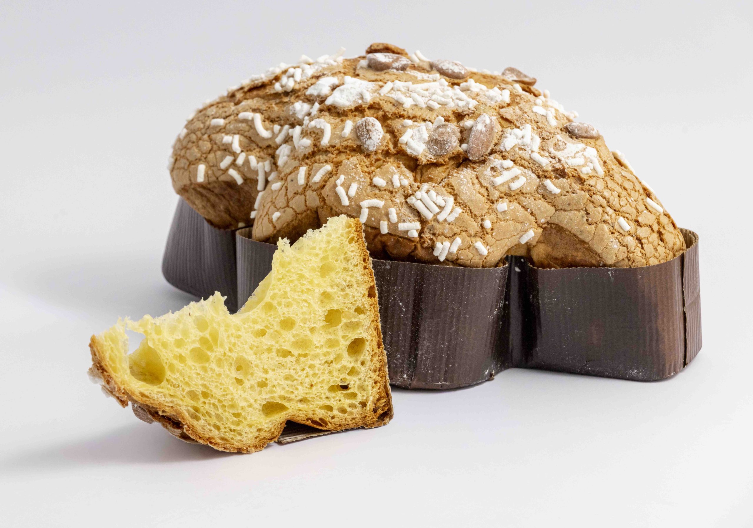 Colomba artigianale a lievitazione naturale con lievito madre, senza frutta candita. Impasto soffice e profumato alla vaniglia naturale, ricoperto da glassa alle mandorle con mandorle intere e granella di zucchero.